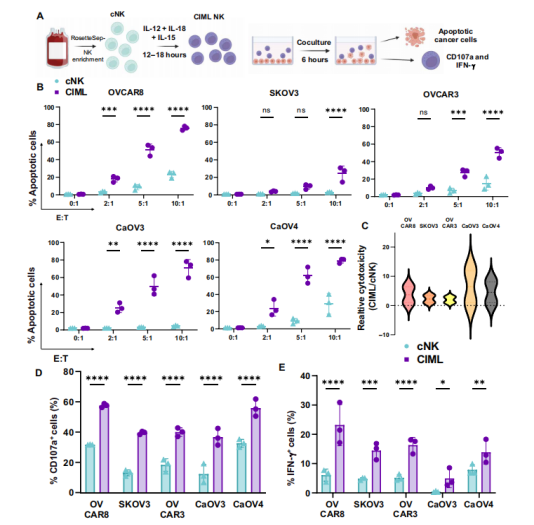 该研究第一时间从健康供体的外周血中分离出NK细胞,并顺利获得特定细胞因子(IL-12、IL-18和IL-15)的短暂激活,诱导其转化为具有记忆样特性的CIML NK细胞。CIML NK细胞与EOC 细胞系(OVCAR8、SKOV3、OVCAR3、CaOV3 、 CaOV4)共培养6小时后,在体外实验中显示出了增强的细胞毒性、脱颗粒化(CD107a)和干扰素γ(IFN-γ)产生,预示着其在抗肿瘤活性方面的潜力。