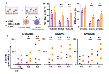 随后,研究团队设计了一种新型的CAR,专门靶向EOC中高表达的MSLN蛋白的膜近域。顺利获得狒狒慢病毒(Baboon lentivirus,BaLV)介导,成功将MSLN-CAR基因转导入CIML NK细胞,制备出MSLN-CAR CIML NK细胞。这些细胞在体外实验中对EOC细胞系显示出显著的细胞毒性和激活状态。在体外实验中,MSLN-CAR CIML NK细胞对EOC细胞系(包括OVCAR8、SKOV3和OVCAR3)表现出了显著的细胞毒性。与未转导的CIML NK细胞相比,MSLN-CAR CIML NK细胞在与EOC细胞系共培养后,显示更高表达的CD107a和IFN-γ,表明其具有更强的抗肿瘤活性。
