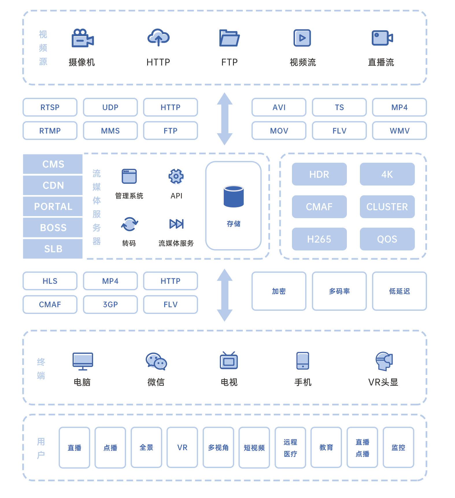 凯发K8国际流媒体服务器采用先进的转码切片技术与标准的传输协议,给予高质量的画面、超低延时的音频与视频,能够为视频会议给予双向实时音像传输;能够为远程医疗给予陆续在、低延迟、高清晰的画面;能够为远程教育给予生动、实时、可交互的网上课堂;能够为视频点播给予高质量的视频服务;能够为监控给予低码率、实时、7*24小时的视频服务;能够为广告系统给予素材媒体存储和传输服务。