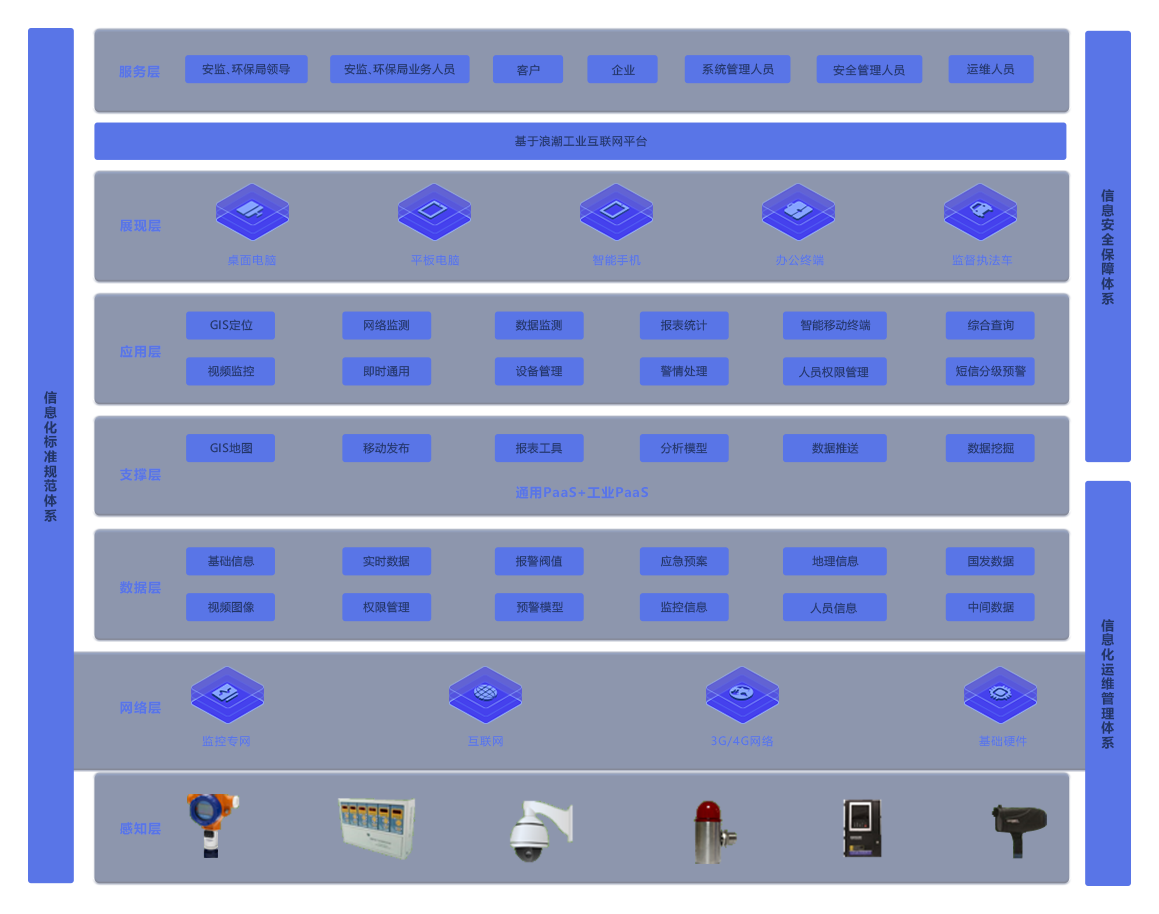感知层是在线监测系统的基本条件。感知层具有超强的环境感知能力和智能性,顺利获得探测仪器、RFID、传感器等技术实现对工厂设备、危险源的监测和控制,对相关重要数据进行采集,为个人和社会给予无处不在的、无所不能的信息服务和应用 网络层是在线监测系统的信息高速公路,主要实现信息的可靠传输和路由,包括监控专网、应用网络、基础硬件等,网络层依托公众电信网和互联网,也可以依托无线传感器网络等专用网络,进行信息的可靠传输 数据层是在线监测系统的数据支撑,在未来的相关应用中,数据是非常重要的战略性资源,因此构建在线监测需给予的数据层是非常重要的一环。数据层主要的目的是顺利获得数据关联、数据挖掘、数据活化等技术解决数据割裂、无法共享的问题。顺利获得数据中心来实现数据共享、数据活化等建立的企业的动态数据中心、数据仓库等。将各类数据资源进行统一规划、统一存储、统一管理 平台支撑层基于云洲大脑搭建,给予面向特定场景的应用。给予相关数据服务接口、GIS地图、数据推送、分析模型、报表工具等。其中,通用云洲大脑给予云计算、大数据、应用开发、中间件、人工智能、区块链等基础服务能力。同时,云洲大脑面向各个行业和领域,给予以数据为核心的工业数据服务、机理模型服务和业务微服务。使应用层的各个功能模块顺利获得凯发K8国际工业互联网平台对不同行业和领域服务,达到信息共享 应用层主要是指在感知层、网络层、数据层、支撑层基础上建立的各种应用系统。包括GIS定位、视频监控、警情处理、设备管理、数据监测等应用,结合展现层为服务层用户给予应用服务 展现层和服务层主要是顺利获得电脑、手机、监督执法车等智能终端,使相关部门领导、企业、管理层、客户等能够实时的分析到相关情况,增进自己的业务,保障信息的共享