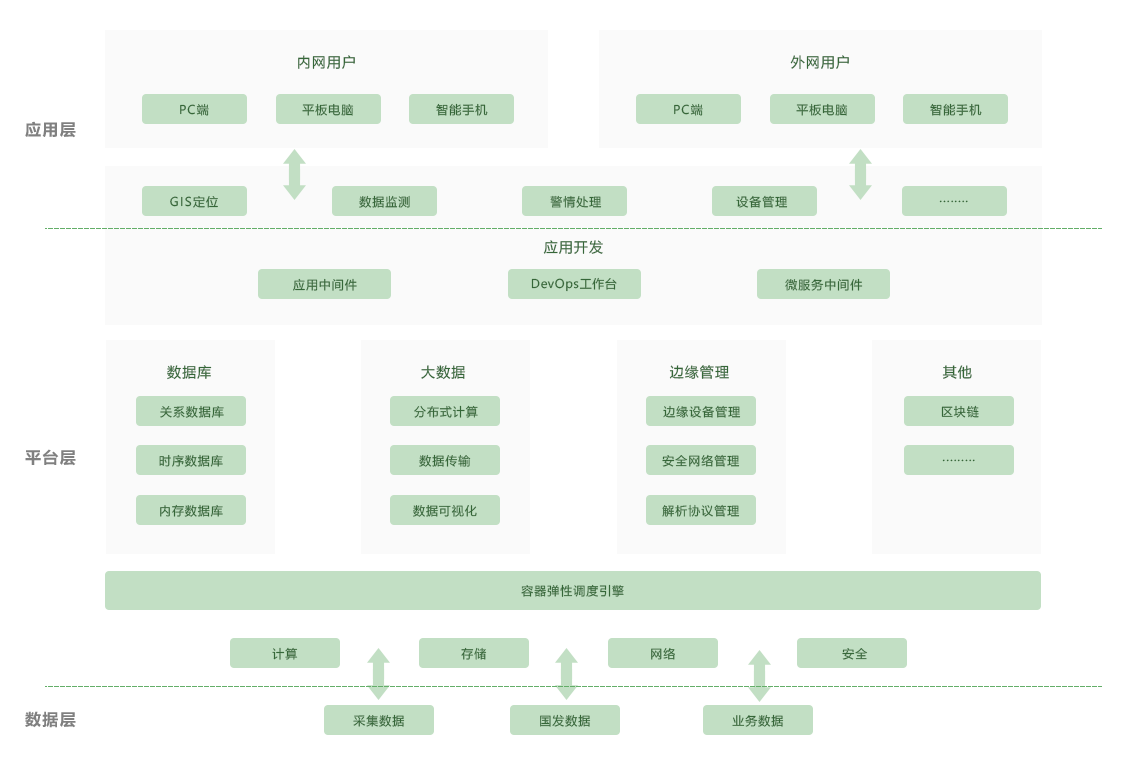 数据层:主要负责整个系统的数据采集以及存储,主要来源为现场设备采集 数据、国家发布数据、业务往来的数据等,为平台和应用形成强大的数据支撑 平台层:平台层分为IaaS层和PaaS层。IaaS层对外给予标准的符合OpenStack规范要求的REST API。对内在功能性、可靠性、安全性、支撑工具等方面全面优化开源 OpenStack,全面接入OpenStack各领域核心组件,给予完善的云基础设施服务能力,涵盖计算、存储、网络、安全等 IaaS服务,根据客户需求能够支持公有云、私有云和混合云三种不同应用模式。PaaS层:给予云计算、大数据、应用开发、中间件、人工智能、区块链等基础PaaS服务能力。顺利获得凯发K8国际企业大脑产品,面向各个行业和领域,给予以数据为核心的工业数据服务、机理模型服务和业务微服务,此外还给予了面向工业设备连接的物联网服务、云化软件和APP开发服务及基于区块链技术构建的云资源管理库 应用层:顺利获得平台的搭建,主要面向石油、化工、冶金等不同行业的不同业务流程,给予GIS定位、数据监测、警情处理、设备管理等相关的应用,为相关人员随时随地关注安全状况和污染情况,对企业全方面的有效管理