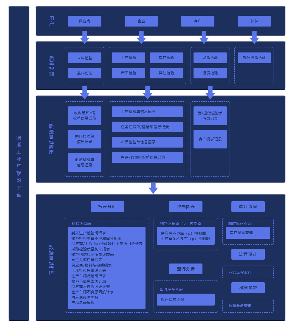 应用层:顺利获得平台的搭建,主要面向不同行业的不同业务流程,给予质量检验建模、SPC分析等相关的应用,实现产品追溯。