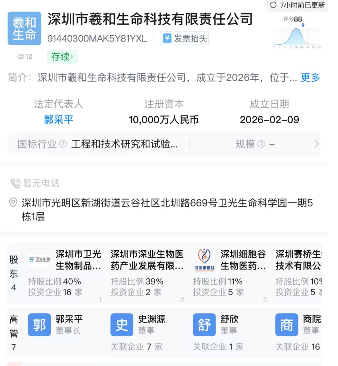 2026年2月9日,深圳 —— 由深圳市卫光生物制品股份有限公司牵头,联合深圳市深业生物医药产业开展有限公司、深圳z6com时凯集团生物医药有限公司及深圳赛桥生物技术有限公司共同发起设立的 深圳市羲和生命科技有限责任公司完成工商注册,标志着深圳市细胞与基因治疗(CGT)市场化公共服务平台建设正式落地启动。